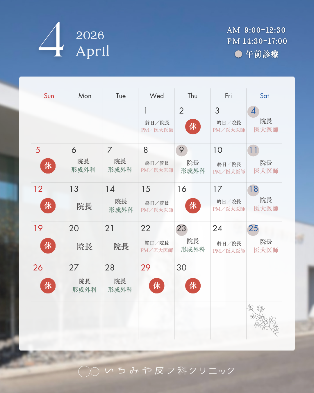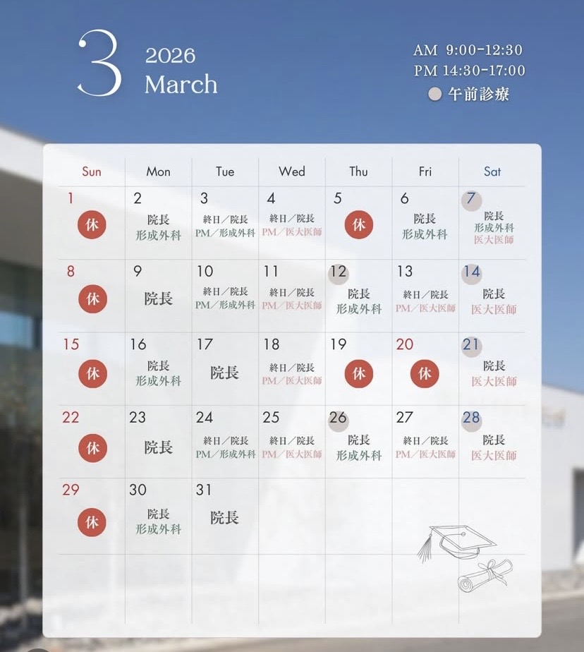 ※土曜日の保険診察は非常勤医師との2診体制となります。第1,3,5の金曜、土曜日は形成外科の手術日です(皮膚科、美容皮膚科もあります)