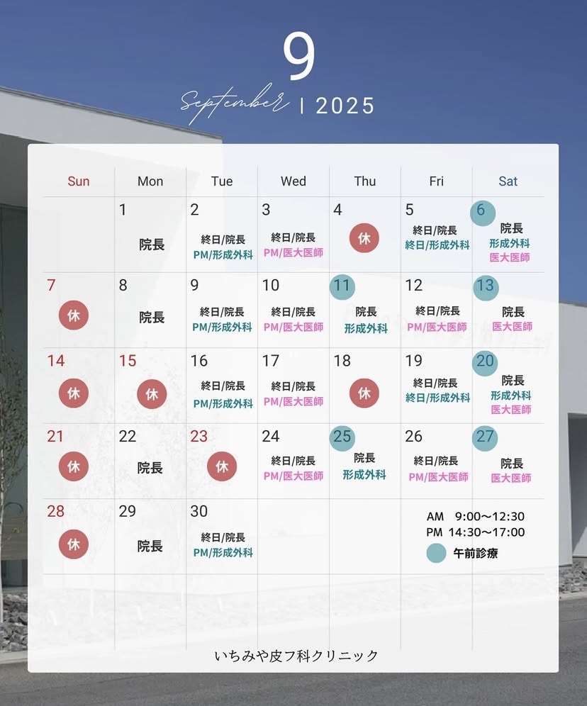 9月のカレンダーです2025.08.31 9月診療日のお知らせです。 保険診療は診療希望日当日の朝8時からネットより順番取りができます。順番取りは、ご予約ではございませんので診療の状況によりお待たせする場合がございます。 お時間に余裕を持ってご来院くださいまうよう、宜しくお願い致します。 PREV PAGE BACK NEXT